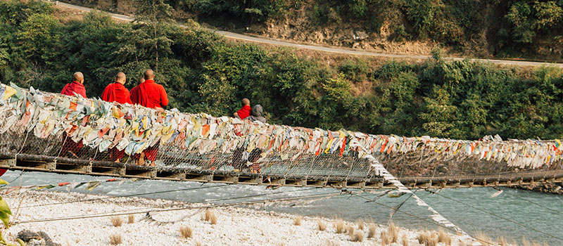 Cross one of Bhutan’s longest suspension bridges, offering sweeping views of the valley and riverbanks.
